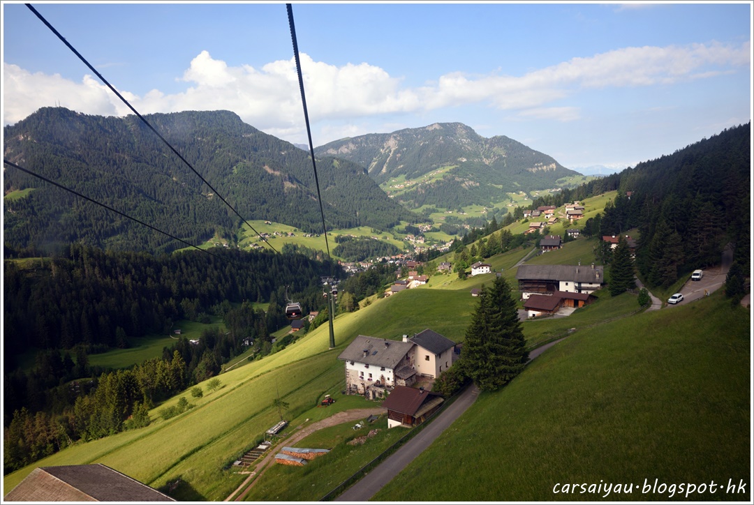 一連五日据齒山行程來到最尾一日, 今日亦由Ortisei開始, 首先坐Seceda纜車線(圖中藍線)殺上据齒山, 呢度係個無敵好位, 能從另一個角度觀賞据齒山西南側的險要及雄偉山峰奇景, 之後行一段遠足徑, 由山頂經Pieralongia行至Col Raiser纜車站(圖中綠線), 再乘Col Raiser纜車線山到St. Cristina(圖中黃線), 然後坐巴士回到Ortisei(圖中紫線), 坐多一次Seceda纜車線上山